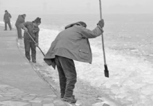采访时正值上午8时,牛师傅正准备与同事们一起去破冰,我们经过询问后才知道,这样做是为了防止冰把湖边的建筑物撑裂,同时还保证了游人的安全,刺骨寒风中,他每天与同事们连续奋战数小时将靠近湖边的冰打碎。午后时分,牛师傅告诉我们,他们将“转战”东湖北岸进行破冰。在冬天,即使冰冻七寸,气温下降到零下十几度,破冰行动仍得继续。采访中,我们不经意地发现牛师傅手掌中厚厚的老茧,这应该是他这么多年风风雨雨最真实的见证。