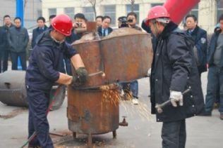 为确保人民群众生命财产安全,为广大人民群众营造安全的生活环境,去年以来,我县对存在安全隐患的移动式承压土锅炉实行了置换,并对土锅炉进行了收缴,于近日集中拆解销毁。图为2月14日,相关部门工作人员在马峪乡对收缴的土锅炉现场拆解销毁。秦华摄影报道