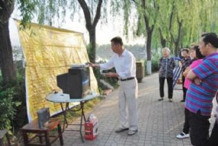 从5月份开始,河南坠子《报母恩》在我县东湖畔悄然唱响,这种别致生动的“孝道”宣传引来了群众的积极参与,得到了群众的广泛好评。图为活动组织者、59岁的陈义在以视频和展板资料的方式向群众讲解尊老爱幼、孝敬父母等传统美德。