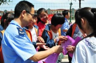6月13日,徐沟工商所在所辖的徐沟、集义、王答等地开展了食品安全进社区、进学校、进农村、进企业、进商场的“五进”宣传活动,共发放宣传资料3000余份。图为该所执法人员在集义中学为学生发放、讲解有关食品安全宣传知识。
