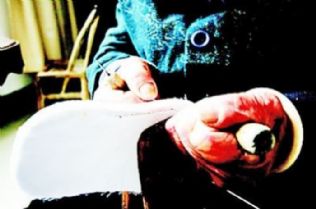 由于纳鞋底很费力,时间一长,容易把手勒破,为了防患,妈妈就带上手托(专门为纳鞋底制做的无指厚手套),重复着同样的动作,一针接一针纳下去,纳出的针脚横看成排侧成行。