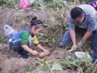 说干就干,我拿起一把铁锹按照张师傅说得铲下去,或许是劲太大,或许是插错了位置,那可怜的红薯被挖出来时已经断成两截。我有些同情这可怜的小家伙了,在我的手下可是遭了秧了。随后,我又选了一个位置,这次有了一些经验,我小心翼翼地把铁铲插了进去,先挖掉一层土,露出了一块小红薯,然后再来一铲子,把它挖了出来。我有些得意了,我会挖红薯了。可是,土有些硬,铲了几分钟,手就开始发麻了,力气也小了很多,于是放下铁锹和大家一起捡起了红薯。老师们一边铲,一边捡,一边说着笑着,几乎是一铁锹下去,跟着就能挖出一串红薯,我们乐滋滋地看着,捡着,挖着,心里真是乐开了花。