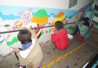 在教师而言,这里是一个实现人生价值的舞台。为了给孩子们创造适宜的成长环境,领导、老师们真可谓各显神通、费尽心机。幼儿园需要更换壁画,有绘画特长的教师便主动承担起绘画的任务,十一月的楼道,寒风飕飕,冻得手难以握紧笔,一会儿爬、一会儿跪、一会儿坐、一会儿站,她们不顾寒冷、不嫌地脏、不管刺鼻的颜料味,利用双休日加班加点,在短短的一周内完成了所有楼道的美化和装饰,看着栩栩如生的《喜洋洋与灰太狼》、《猪八戒吃西瓜》的画面,在欣赏其美妙的同时,更让人赞叹的是画面背后所蕴含的“执着、奉献”的职幼精神。
