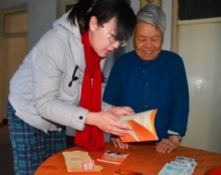 为照顾行动不便的独居空巢老人,11月30日,清源路社区工作人员贴心服务,将居家养老服务券送到独居老人手中。图为工作人员为独居老人耐心讲解居家养老服务券的使用方法。