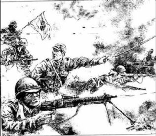 原来敌人对我军在其运输物资到太原的路上打伏击早有准备,不仅派出一个连的兵力负责押运,还让沿途敌军派出队伍随时接应。敌清源工兵团听到他们的押运队伍被我军伏击的枪声后,火速赶到牛家口,气势汹汹地向我17支队五连扑了过来,妄想把我军的包围圈撕开一个口子,解救敌押运队伍和物资。战场形势一时间发生了很大的变化,在牛家口南我军只有一个连的兵力,而敌人的援兵多达一个团,并且武器精良,是阎匪军的精锐部队。连长武毛娃马上将情况报告了杨德千主任,杨德千主任当机立断,命令一连全线出击,尽快消灭被我包围的敌人押运队伍。保证将敌人的大车物资全部运上山。五连在敌人情况不明、立足未稳的时候,以五连三排为突击队,向敌人发起冲锋,以狭路相逢勇者胜的大无畏的革命英雄气概,打退敌清源工兵团的进攻。接到命令后,我带领三排步兵班的战士向着敌人冲了过去……