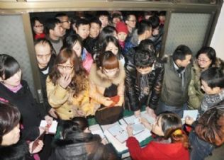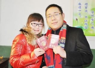 县农发行的张亚楠和招商银行的刘馨是第一对预约的新人。他们将于正月二十一举行婚礼。“‘201314,爱你一生一世’,这个日子太值得纪念了,我们想在这一天领证。”张亚楠对记者说。“我们是2012年12月5日预约的,今天早上不到8点就来了,可大厅里已经排了四五十号人。”排了2个多小时的队,小张和小刘终于登记了,他们高兴地向记者展示了刚刚领到的结婚证。