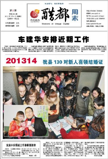 本报讯1月4日,政务大厅民政窗口创下了一天130对新人登记领取结婚证的新纪录。 2013年1月...
