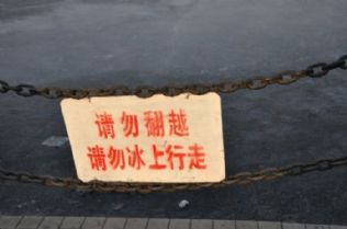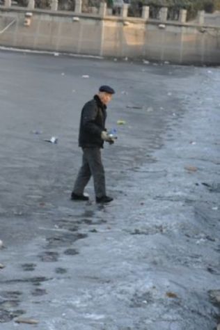 本报讯1月15日下午,记者在东湖边看到三个年轻人结伴在结冰的湖面上打闹戏耍,随后,又看到一稍上年纪的老者为了捡拾人们丢在湖边的饮料瓶而在薄薄的冰面上走来走去,全然不顾冰面危险提示牌的警示,让人看着感到后怕。