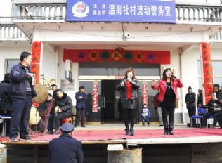 穿过车水马龙的杂货摊,挤进温南社村级组织场所这片“大磁场”,幸福的新农村原生态以该村村委会为圆心向着四周扩展:台下,该村老年协会锣鼓队在手舞绢花、英姿飒爽的指挥引领下,为该村票儿班的正式开场隆重铺垫。台上,搬运工兼服务生的该村村委会主任温利明进进出出搬运着舞台道具,县老龄委下乡工作队队员王定河正招呼着票儿班演职人员各就各位。不多时,票儿班文武场上的“乡村器乐民星”已候在舞台两侧,调着弦、支起架,头上罩着“白羊肚”毛巾,脚边摆着菜筐子、肥料袋等用以装运乐器的工具。剧场内,农用三轮车、电动车环绕在升旗台下,成为村民们的扶手、板凳,也成为孩子们看戏玩耍的绝佳游乐处……这些枝枝叶叶,都在为票儿班闪亮出场铺垫着。