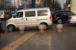 人横车也横,随停路当中,盲道隔离墩,此君目中空。