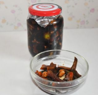 母亲说,将原料胡萝卜、黄瓜、尖椒、莲菜(焯一下)等洗净切成长条状,用盐腌10分钟;将花生米放锅里煮熟,然后,把酱油(多倒点)倒锅里,再放入少量白酒、白糖、辣椒,等煮开后关火;将腌好的原料装瓶;将完全冷却的酱油汁倒入瓶中(淹没原料),封口,三天后打开就可以吃了。母亲特别嘱咐,操作的重点是必须等酱汁完全冷却后再装瓶,还有,白酒是提鲜的,千万不能少,也不能拿其它黄酒药酒等代替。