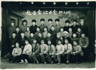 1973年7月,我高中毕业后,响应党的号召,回到家乡——清徐县柳杜大队务农。由于劳动积极,表现好,同年12月加入了中国共产党,进入大队领导班子,担任妇女主任,并分管宣传等项工作。在当时突出政治的年代,每年农闲的春节前后,公社都要组织各大队、企事业单位进行文艺演出比赛,选出优秀节目赴县进行会演。这张照片是1975年1月28日,我带领山西纺织厂在柳杜大队插队的知识青年演员与我村的乐队成员,赴县文艺会演后的合影。第三排左二为本人。