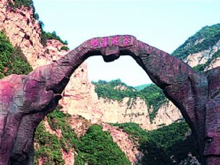 巍巍青山两岸,一座双象勾鼻的园林拱门,一道飞瀑,大气宏伟,俏皮而充满生机,上书:“红崖峡谷”。这便是灵石红崖沟了。