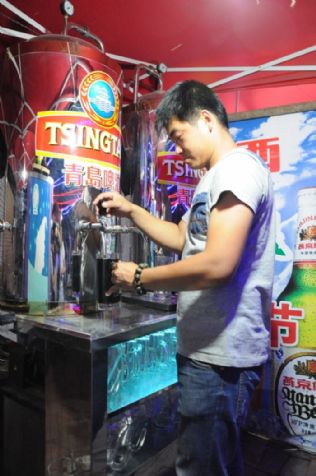 风车边的“啤酒节”提供的啤酒有两种,燕京啤酒和青岛啤酒,燕京啤酒5元一瓶;青岛啤酒又分“红扎”“黄扎”和“黑扎”,价位都是10元一大杯,50元一炮(3L)。