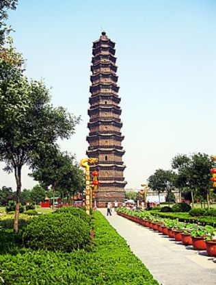 铁塔,又名开宝寺塔。始建于北宋皇佑元年(公元1049年),距今已有960多年了。塔仿木制楼阁形式,8角13层,高55.63米。内为砖砌,外用琉璃砖包砌。建造时,塔的门窗、斗拱、塔檐、平座等部位,共用琉璃砖瓦28种,并以红褐色为主,远看近似铁色,故称为铁塔。我们去时,正当红日高照,塔身五光十色,绚丽夺目,折射出迷人的光芒,远望犹如一条美丽的彩虹。