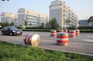紫林路上一座隔离墩受到汽车猛烈撞击