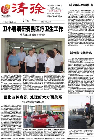 本报讯8月12日,县委书记韩良会赴县人大和县政协调研。县委常委、县委办主任邢蕴武一同调研。 韩...