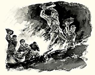 五位战士胜利地完成了掩护任务,准备转移。前面有两条路:一条通往主力转移的方向,走这条路可以很快追上部队,可是敌人紧跟在后边;另一条路是通往狼牙山的顶峰棋盘陀,那里三面都是悬崖绝壁。为了不让敌人发现群众和连队主力,班长马宝玉决定把敌人引上绝路。