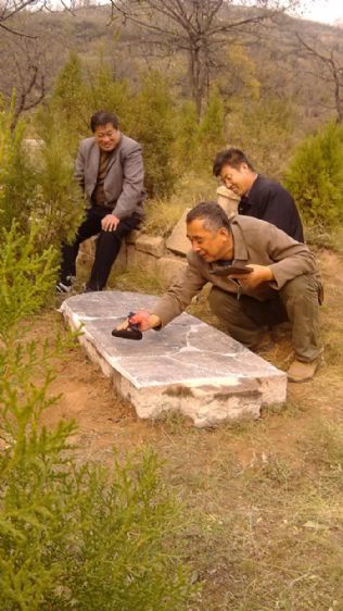 崔驸马的故事在清徐广为流传,却无人说得上崔之名讳,直到2013年10月,武树威才说起崔家山有崔驸马墓及碑,并带领王保玉、郭会生、代文萍实地察看。当月16日,笔者与郭会生、武宝生、白建生等上山,始见到比较完整的碑文。墓地位于东于山中梁“楼拐角”前,其形势特别。伸出的山梁,被两侧的流水切割成v字形,村民称其地名为长短畛。现属六段地村。长短畛东是水地河,西有坟儿湾,两水两沟汇合为火焰坪沟,即方山河。坟茔早已毁坏,只存储在老人们的回忆里。墓穴石料被用作了梯田田埂,唯一一通墓碑也被文革砸成11块。一旁还弃留半截无法辩认的残碑。我等把碑块拼凑在一起,会生进行了拓印。