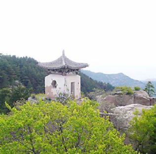 山路的尽头是一片开阔的空地,雄伟的陀罗山主峰近在咫尺。仰望主峰,巍峨壮观,高耸入云。漫山遍野的青松郁郁苍苍,遮天蔽日。一条曲折盘回的台阶山路悬挂在山石之间,时而裸露在危岩之侧,时而掩映在苍翠之中,曲曲折折直通峰顶,令人未登先惧,望而生畏。大家怀着豪迈的心情沿着一层层石阶继续向上攀登。石阶路多呈“之”字型,时陡时缓,时宽时窄,路旁古树森森,颇有意境,或是山花烂漫,春意盎然。仰望前方,山路蜿蜒如登天云梯,悬若游丝;经过艰难的攀登,大家终于走完了1585级石阶来到陀罗山的最高处—清凉顶。这里山高树茂,浓荫蔽日,风声呼啸,松涛阵阵,确实给人一种凉爽舒适、心旷神怡的感觉。山门外有龟蛇二石把门,院内左侧石壁上有清朝光绪年间忻州知州方戊昌书写的“日近云低”四个大字,另有“到此清凉”四字,作者难考。山顶有块巨大、平整的清凉石,一座文殊庙巍然矗立。另有避暑楼、梳妆楼等古时建筑,却是1993年重建的。大家站在庙前的石头上,听着呼啸的风声和阵阵松涛,极目远眺,万千景象尽收眼底,一览无余,大有一览众山小的畅快。爬山的劳累顿时消失,不见踪影。此时,不由得让人想起林则徐“海到无边天作岸,山登绝顶我为峰”的佳对,大家的心情更加豪迈,也更加佩服古人的气魄和胸襟。