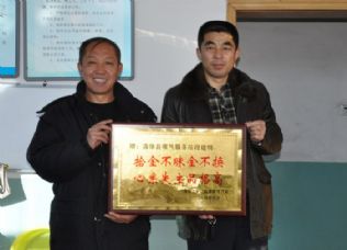 本报讯1月20日上午,县煤气服务站办公室,兴盛起重有限公司的梁胜瑞将一面写有“拾金不昧金不换,心系失主品格高”的牌匾交到巡线员段建明的手上,感激之情溢于言表。