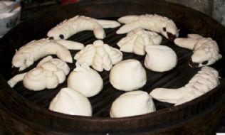 这时,奶奶拿了两颗黑豆,安在鱼嘴的上方,成了鱼的眼睛,又拿筷子蘸了一点红色,点在鱼嘴上,最后拿刀在鱼身上横竖划了几道,当做鱼鳞,这样,一个活灵活现的花馍就基本成型了。除了鱼,奶奶还会做很多东西,比如花,尤其是牡丹,预示着雍容华贵,生活富足;还要捏四只鸡,放在屋子四角,象征着四季平安;还有“枣扇”……当这些各式各样的花馍摆满整个面板的时候,奶奶就会小心翼翼地将它们摆放在蒸锅中,然后将炉火烧到最旺,把盖子盖好,坐等成品出锅了。幼时,每每这个时候,我都是迫不及待,总想打开锅盖,看看它们熟了没。但奶奶却盯得我很紧,每当我想打开锅盖的时候,总会被奶奶发现,她就筷子敲一下我的手,我只得乖乖把手缩回来,就这样来回好几次,终于奶奶站起身来,将锅盖揭了开来,一股热气腾空而起,笼罩在锅的上方,连同我伸过去的脑袋一起被吞没。当然,这个时候,我也什么都看不见,得等那热气散尽,我才可以看到肉鼓鼓的金鱼,雄赳赳的公鸡,禁不住拍手跳跃。
