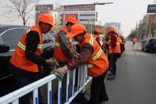 县市容环卫局组织人员对广告栏、交通防护栏进行擦洗