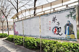 教学楼一楼墙上,“爱、善、智、诺、行”五个大字,辅之以“怀表成了鸡蛋、小孩的心、王羲之吃墨、季布‘一诺千金’、柳公权拜师‘脚书老人’”五个思想教育故事,二楼墙上,“勤、真、谦、悟、趣”,辅之以五个提高成绩方法的实例,静静儿站在楼道内,用鼓励的神态眼神,用经典的言传身教,为学生做人做事鼓起风帆,吹响号角。