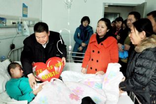 这是2013年12月4日上午发生在山西省烧伤救治中心病房里的一幕。省希望工程办公室、团市委、团县委、县教育局负责人把46167元“爱心一元捐”资助款送到了遭遇车祸、重病住院的我县南营留村小学生郑竟才的手中,帮助他接受进一步治疗。