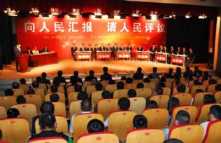本报讯4月30日,我县在文体中心小剧场举行“向人民汇报,请人民评议”面对面评议活动,12家参评部门接受“民意考问”。市委党的群众路线教育实践活动第八督导组组长陈其武,副组长王剑,市纪委副书记、监察局局长李国敏,县委书记韩良会,县长王琳玉等县四大班子领导出席。