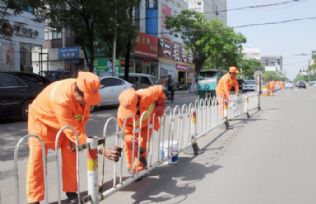 5月12日下午,县市容环卫局组织部分环卫工人,对街头的广告栏、交通防护栏进行了擦洗。