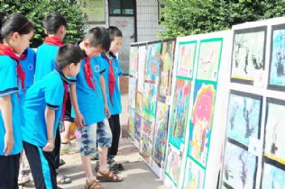 5月30日,县职工子弟学校四(2)班的同学在观看学校“六一”期间举办的素质教育成果展。张太义摄