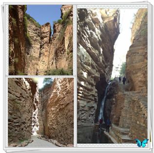 我们沿着牌楼石阶,进入从东南面进山的唯一通道——瓮圪廊。瓮圪廊双峰耸立,直逼云端,东西长0.5公里,南北宽仅丈许,是一“S”型天然山廊。一股不竭的山泉在廊底潺潺流淌。抬头仰望,千仞绝壁,并立欲合,只见蓝天一线。一架依山开凿的石梯,从北边的险壁上伸出来,倾斜而下,把我们接住。石梯高达120余级,分上下两段,中间有吊桥连接。我站在吊桥上,仰视头顶,千丈峭壁,高耸入云;俯瞰身下,百丈深渊,碧水翻旋。在军事上,瓮圪廊可算是“一夫当关,万夫莫开”的险关。当年在黄崖洞保卫战中,17岁的八路军小号手崔振方就在此凭借天险,只身守卫南口阵地观察哨,用兵工厂自制的马尾弹120多枚,打退了日军数10次进攻,歼敌10余名,最后壮烈殉国。