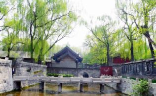 晋祠的冬天稍稍显得有些凄凉,褐黄成为她的主色调,凋落了叶子的树枝光秃秃的枝桠着,偶尔有一只斑鸠缩着脑袋栖落在树梢,游人也三三两两的疏落起来,喧闹了许久的晋祠变得恬静优雅,就连鱼沼飞梁里的金鱼也懒洋洋的一动不动,殿堂楼阁都像被冬天施了魔法一样,安静地睡着了……冬天,我总是盼着下雪,那时的晋祠就像一个晶莹剔透的童话般的世界,千里冰封、万里雪飘,皑皑白雪覆盖了这个世界,只有松柏带着白色的雪帽,还绽放着绿色的笑脸,一座座古代建筑在稠稠的雪的浓雾里,依然展现着千年不变的红色。我独自站在圣母殿前,深深吸一口气,全身都灌满了冬天独特的清凉,融化在冰凉的雪花的世界里,极目远眺,似乎可以望见整个的晋祠,浓墨渲染、素笔描绘的晋祠!
