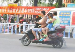 马路光膀哥,全家挤摩托。安全脑后抛,车技堪为高。