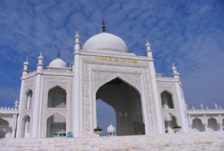 我们从东面的正门进入文化园,首先站在大团结广场上。这是占地17000平方米的大型广场,是举行盛大集会和大型文化演出的场所,可同时容纳2万多人。迎面便是园区的主体大门,它借鉴了印度泰姬陵的优美造型,通高38米,两侧建有206米的廊房,白色的墙体上饰以伊斯兰风格的浮雕图案,显得古朴、凝重。它比新疆喀什艾提尕尔清真寺的大门,更大更有创意。走进她,洁白的身躯,饱满的穹顶,绚丽的浮雕,缤纷的彩绘,精巧的结构,在西北特有的蔚蓝天空映衬下,给人以心灵的震憾,太美了!