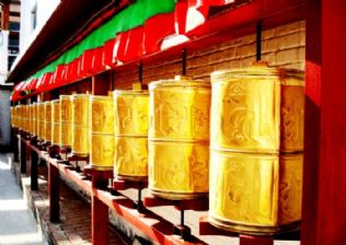 白塔周围都是经筒,听导游说藏民每次来此都会转白塔,转数最少为三圈,然后可以是三的倍数,有些藏民,怕忘记自己转了的圈数,会捡小石子放在塔边,每转一圈放一颗小石子。在这里,我转动经筒,念着六字真言,转了三圈。当我转完之后,到旁边的木头椅上休息时,刚刚那个教我磕长头的卓玛冲着我微笑了,说真的,来到西藏,到处都是藏民,尤其是在寺庙附近,他们会毫无旁人的感觉,只为转动经筒,只为朝拜,在他们眼里游人和他们根本不是一个世界的人,也不会和你打招呼。可是当我也学着他们的信仰,去祈福,去朝拜,他们却如此的亲切。