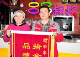 本报讯近日,失主韩女士夫妇将一面写着“拾金不昧、品德高尚”的锦旗送到了“串串叔叔”快餐店,对他们拾金不昧的高尚行为表示感谢。前些日子,韩女士夫妇在“串串叔叔”就餐时,不慎将钱包遗失,内有现金一千余元和价值近九万元的存折、支票等物。当“串串叔叔”快餐店店长张元和员工梁婷婷根据钱包内身份证信息找到他们时,这对“马大哈”夫妇还不知道钱包已经遗失。据韩女士介绍,钱包里的钱,是给老父亲治病用的“救命钱”。