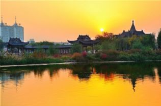 怡心楼阁彩霞漫,金秋夕阳湖中燃。团团火焰生绿丛,天水一片红彤彤。