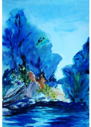 水天成一色,秋韵漫树梢。层林蓝染遍,深绿踮脚眺。