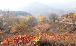 山路上静静的,没有一辆车,不时有鸟叫声传来,清脆悦耳,心旷神怡。走了很远的路,身体开始出汗,腿也觉得吃力,不知道转了多少个弯,才上到山的高处。回首望去,来时的路一会儿在左,一会儿在右,绕来绕去,忽隐忽现。山下的风景愈加好看,好像画画的孩子不小心打翻了油彩盒。走过一处刚刚整修好的滑坡地带,终于看到了同样掩映在红绿黄当中美丽的东石窖村和西石窖村。从这边望去,层层的葡萄架挂在山腰,叶子就像红葡萄酒的颜色,浓烈醇正。大自然的调色板让山间的各种树叶都改变了颜色,还有白色的芦苇随风舞动……这才真正理解什么叫做“层林尽染”!