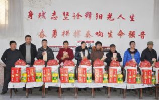 “焦总,谢谢你!过节不忘残疾人!”领到一袋面、一桶油、一袋苹果、一箱柑桔和300元钱,来自迎宪村68岁的王二发,紧紧拉住志海混凝土公司总经理焦琨的手,激动得热泪盈眶。