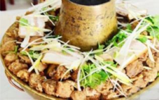 在铜火锅内放置烧肉,丸子,炸豆腐,粉条,土豆,海带等,边吃边煮,一家人围坐火锅旁,热闹非常。