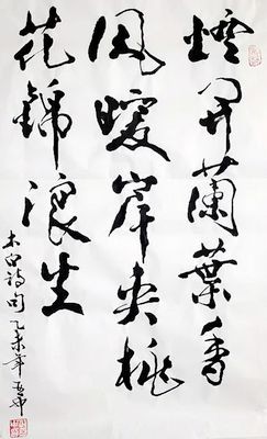 今年春节,玄真子朋友通过微信不时为我发来一些书画作品。有书法,字是瘦金体;有虾图、墨竹、荷花等。止于欣赏。心想,不知道转发了哪位大家的作品。电话问询,说是亚中的新作,我先是一惊,继而摇头,用朋友们的戏言,微信,微信,就是微微地相信。三月的一天,到一朋友处办事,不经意间,发现墙上贴一幅书法作品,用瘦金体书写着李白的诗句:烟开兰叶香风暖,岸夹桃花锦浪生。