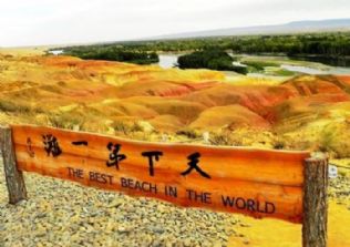 亿万年的地质变化,将五彩滩的自然地貌雕刻成眼前令人震惊的模样。一堆堆奇石怪岩,像城堡、像佛塔、像兵马俑般地陈列,壮丽之极。城堡、山谷里辉煌的红色、黄色,甚至紫色,使得对岸的绿色河谷更加清幽宁静。难以想像,这两种截然不同的地貌,是如何唇齿相依般在一起,构成一幅“天然图画”的呢?五彩滩不但风光神奇,而且还是一座天然宝库,储藏着丰富的石油资源和大量的黄金、玛瑙、石英、铝、锌等10多种矿产。在沙漠植被地带还栖居着野驴、石鸡等珍禽异兽。此外,这里还有许多如恐龙沟、硅化木、金矿等自然景观和人文景观。