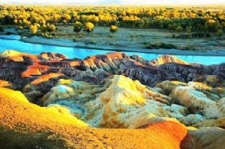 当我们赶到五彩滩时,正是黄昏,阳光没有了白天的焦灼,只剩下轻柔的暖意。进入景区大门,我们沿着木栈道前行。五彩滩毗邻像蓝色缎带一样,幽雅地飘向远方的额尔齐斯河。这里“一河隔两岸,胜似两重天”。大自然的鬼斧神工,将此截然不同的两种地貌巧妙地结合在一起,构成一幅浑然天成的别样景致。南岸,绿洲处处,绿草茵茵,绿树葳蕤,连绵成林。遥望远处,山峦逶迤,沙漠起伏,这一切与蓝色的天际融合,戈壁风光,妩媚动人,尽收眼底。