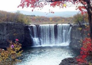 乘坐景区的电瓶车,我们首先来到吊水楼瀑布。它位于镜泊湖的最北端,是我国著名的瀑布之一。只见奔腾呼啸的湖水,以雷霆万钧之势,席卷着平滑的熔岩床面,从断层峭壁上喧嚣而下,形成幅宽40多米、落差20余米,响声震天,浪花飞溅的大瀑布,在阳光下形成美丽的彩虹。瀑布飞落的黑龙潭,呈圆形,最大直径100多米,水深达60余米。南、西、北三面是20多米高的黑褐色的悬崖峭壁,东面是潭壁开口,潭水从这里泄出,又开始了牡丹江新一段流淌河道。据说即使是最严寒的冬季,潭壁挂满晶莹剔透的冰柱,潭水依然不冻,成为冬日镜泊湖的一大奇异景观。