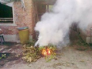 在农村不缺的就是烧火的“柴”,随处可见的废木料、粮食秸秆都是点火的最佳原料。小时候总会陪在大人身旁一把一把地把准备好的“柴”置于火堆之上,眼睛目不转睛地盯着燃烧的火苗,仔细听那木料燃烧时的噼噼啪啪声。有时还会找几个伙伴围着火堆又唱又跳,真有点篝火晚会的影子。由于这样的熏蚊子一般是在傍晚的院里进行的,通过燃烧“柴”而冒出的浓烟几乎会在短时间内把整个院子吞没。偶尔一不小心浓烟入眼,也会瞬间催泪而下。所以,对于小小的蚊子而言,浓烟弥散的结果会直接把它们赶得远远的。