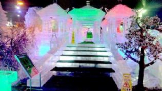 最后一部分是佛教寺庙中佛祖、菩萨雪雕造像,名曰《百佛山》,众佛云集,给大家上了一堂传统佛教文化的扫盲课。“佛”自唐朝从印度传入我国,发展至今,已经在很多炎黄子孙的心中占据了一定的位置。大型雪雕《弥勒佛》,坐于莲花雪台之上,袒胸露乳,嬉笑颜开,神态可掬,精心雕刻的佛脐和胸前那串佛珠,可见雕刻艺术之精湛。观音菩萨手捧净瓶,脚踏宝莲,形像逼真,从任何一个方向看,一式的慈眉善目,一式的宝相庄严。我看到有些虔诚的善男信女们,毕恭毕敬地叩拜(室内不准烧香),祈求菩萨能够圆他们心中所愿。