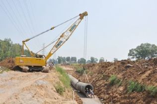 本报讯8月28日午时,记者在引黄入清工程孔村段看到,工地上彩旗飘飘,6台挖机一字排开,仍在烈日下轰鸣着、工作着,履带吊机正在哨声和指挥棒的指引下小心地下放管道,几十台水泵在紧张地抽着地下水,几米深的巷道下,头带安全帽的工人师傅们有的在安装管道,有的在铺设管网。